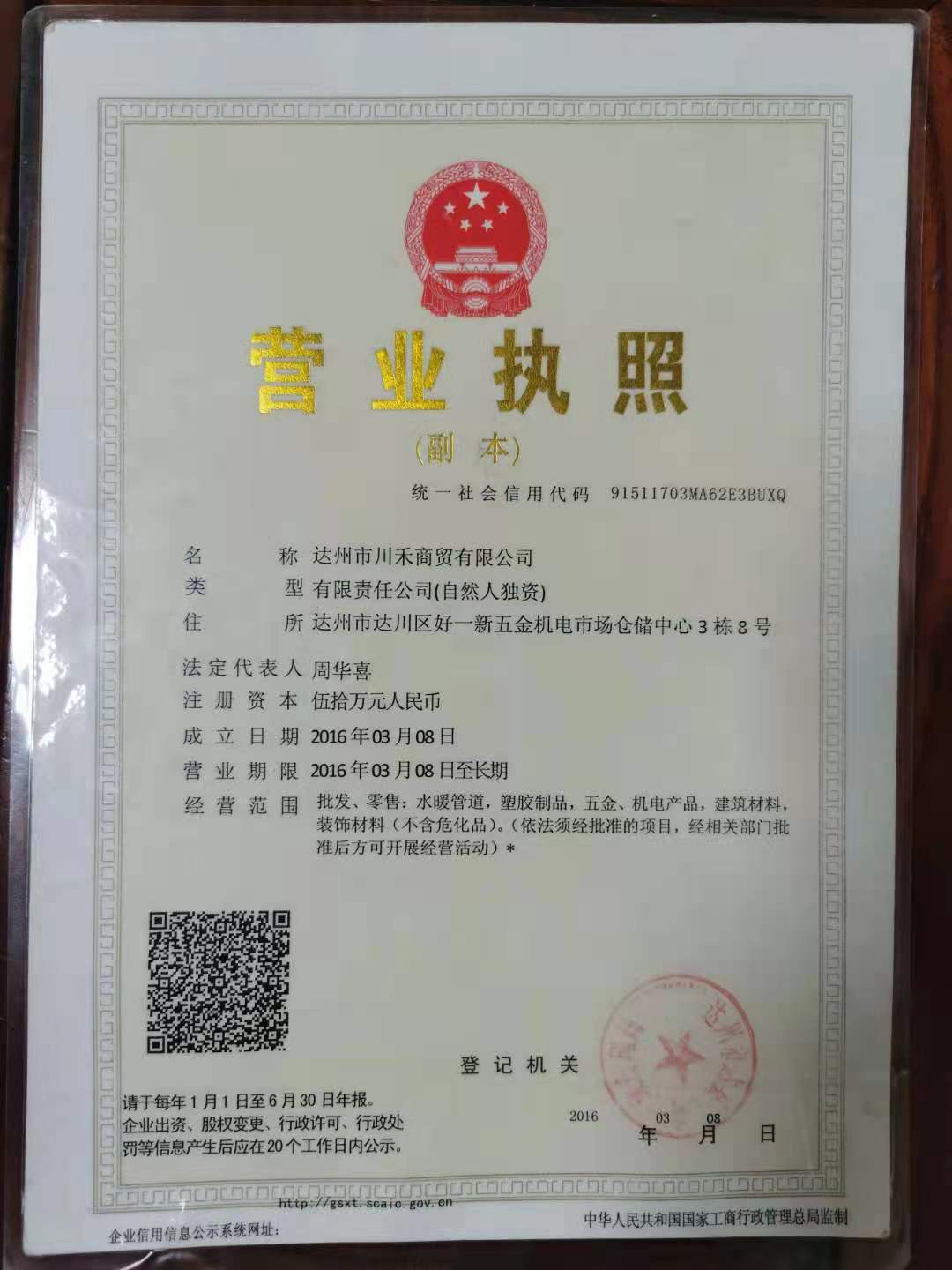 達州市川禾商貿(mào)有限公司是一家專業(yè)從事銷售各種型號規(guī)格的給水、排水、穿線管道等市政工程管道的公司,  聯(lián)塑管道的達州市正規(guī)代理商.
